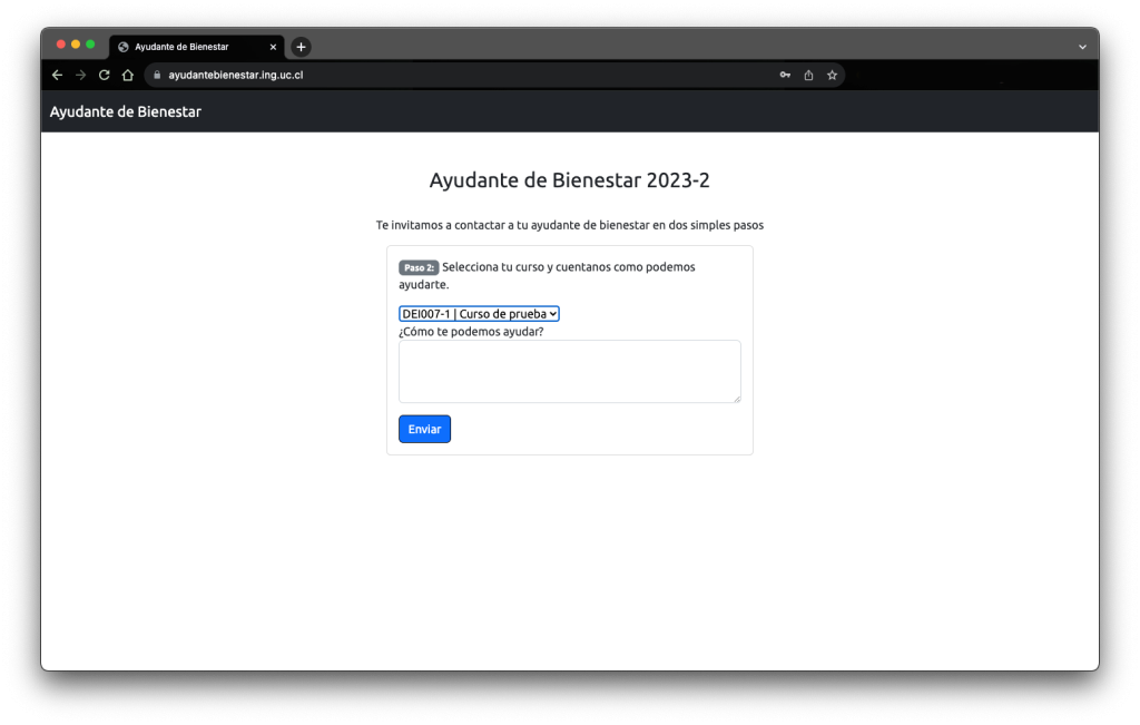 Para facilitar el contacto entre el ayudante de bienestar asignado al curso y el estudiante, se desarrolló esta plataforma, la cual funciona como un sistema de mensajería entre ambas partes. El estudiante hará uso de sus credenciales institucionales, seleccionará el curso y se podrá contactar de forma rápida con el ayudante asignado a su curso y sección.